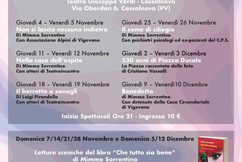 Dal 4 novembre al 12 dicembre 2021 presso il Teatro Verdi di Cassolnovo Teatroincontro propone la rassegna autunnale del progetto “L’arte dell’inclusione: Vigevano città del teatro partecipato – Educarsì alla Libertà” con il sostegno di Mibact, Ministero della Giustizia, Next Regione Lombardia, Fondazione Piacenza e Vigevano, Comune di Cassolnovo, ASST Dipartimento di Salute Mentale e Dipendenze, Casa Circondariale di Vigevano, ASMV Istituto De Roldolfi, Associazione Alpini di Vigevano.