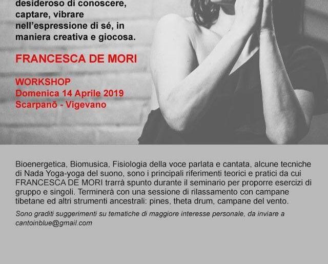 Bioenergetica, Biomuisca, Fisiologia della voce parlata e cantata, alcune tecniche di Nata Yoga-Yoga del suono, sono i principali riferimenti teorici e pratici da cui FRANCESCA DE MORI trarrà spunto durante il seminario per proporre esercizi di gruppo e singoli. Terminerà con una sessione di rilassamento con campane tibetane ed altri strumenti ancestrali: pines, theta drum, campane del vento.