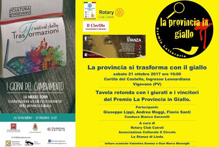 Nell’ambito del Festival delle trasformazioni, il 21 ottobre nelle sale conferenze del Museo Leonardiana, aperte per la prima volta per un incontro letterario, si svolgerà una Tavola rotonda che si annuncia assai interessante (e da brivido!): protagonisti i giurati del Premio La Provincia in giallo, organizzato dal Rotary Club Cairoli con il coordinamento di Bianca Garavelli e il prezioso contributo di ILPRA s. p. a., giunto nel 2017 alla sesta edizione.