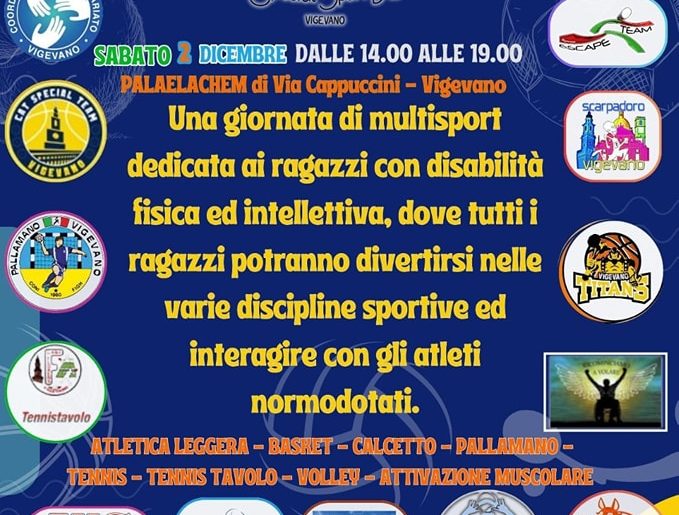 Sabato 2 Dicembre al PALAELACHEM di Vigevano, dalle 14.00 alle 19.00, ci sarà la giornata dedicata allo sport per persone con disabilità fisica e psichica, dove tutti i ragazzi con disabilità potranno divertirsi provando diverse discipline sportive ed interagire con atleti delle associazioni sportive. Tutte le attività saranno all’interno del Palazzetto dello sport, che sarà aperto anche a tutte coloro che vorranno esserci per seguire e divertirsi insieme ai ragazzi