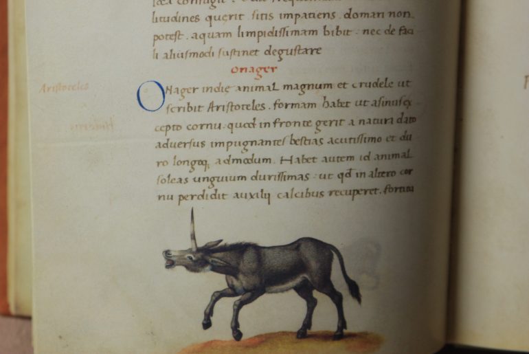 Altro esempio di animale simbolico era l’unicorno, il quale nel nostro volume viene rappresentato non solo come un nobile equino ma a volte anche come mulo o asino, con svariati tipi di corni. Era il simbolo di un animale indomabile, se non da una donna vergine in grado di proteggerlo dalla cattiveria umana lasciandolo riposare sul suo grembo. Non a caso questa figura mitologica veniva associata alla figura di Cristo nato dal grembo della Vergine Maria.
