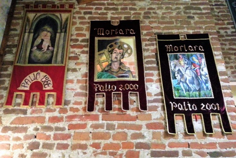 Sant’Antonio Abate, riconoscibile dal maialino che gli sta ai piedi, il Battesimo di Gesù e la Madonna in trono, con ai lati Sant’Albino, Sant’Agostino e San Giacomo. Nella figura inginocchiata del dipinto gli studiosi hanno voluto vedere il ritratto del committente, del quale non è rimasto il nome, ma lo stemma del casato. La cornice che racchiude i dipinti porta impresso più volte tale stemma, simile a quello della famiglia Maletta. Sotto il trittico di Giovanni da Milano è visibile un affresco di autore ignoto, che raffigura San Lorenzo, attribuito al sec. XV.