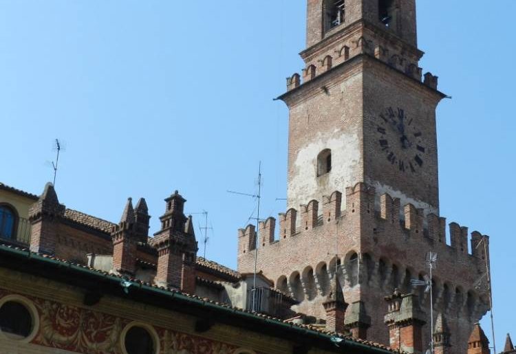 L’origine della Torre, situata nel punto più alto della città, presso il castello, risale al 1198 e fu terminata dal Bramante alla fine del XV secolo, mentre nel XVII secolo venne aggiunto il cupolino barocco “a cipolla” in sostituzione dell’originaria guglia conica. La Torre ha una forma originale che, nell’800, fu il modello per la torre del Filarete nel Castello Sforzesco di Milano; è costituita da sezioni che si restringono avvicinandosi alla cima. Dalla merlatura sotto l’orologio si ha un’ottima visuale della Piazza Ducale, del Castello e di tutta la città.