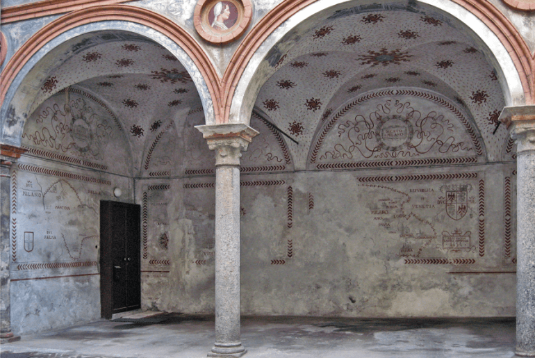 Il portone di legno, ad arco, ha cornici in cotto e spallette in granito con capitelli e immette, attraverso un androne con soffitto a crociere, in un cortile quadrato, veramente degno di nota. Su due lati della corte si aprono due portici a quattro colonne che reggono archi a tutto sesto; nell’interstizio degli archi sono incastonati medaglioni raffiguranti busti di personaggi a tutt’oggi non identificati.